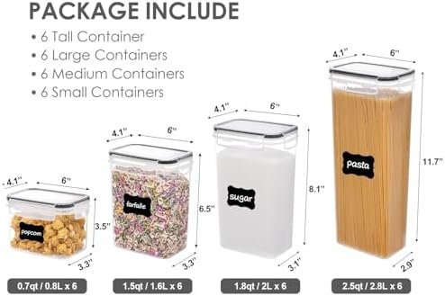 4 Size Combinations Fit Your Needs — Our kitchen storage container set comes in 4 different sizes. Includes 6 Tall Container (2.5quart/2.8 liters), 6 Large Containers (1.8quart/2.0 liters), 6 Medium Containers (1.5quart/1.6 liters), 6 Small Containers (0.7quart/0.8 liters). Perfect for storing spaghetti, baking supplies, cereal, flour, sugar, oats, pasta, rice, coffee, tea, snacks, nuts and other dry goods.