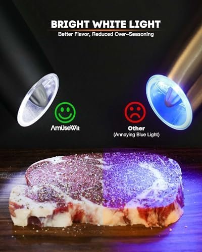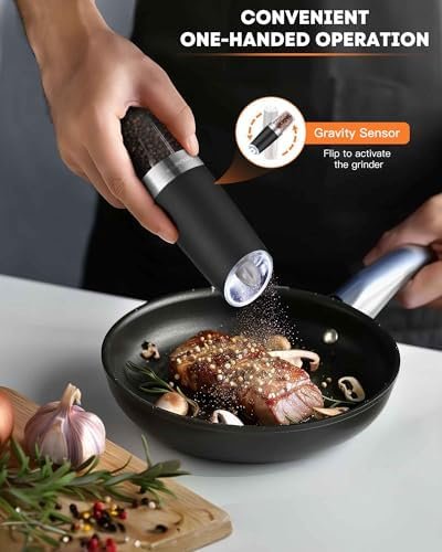 CONVENIENT ONE-HANDED OPERATION – The gravity pepper grinder is gravity activated. Just simply turn upside down and get fresh ground salt or pepper till your heart is content. No buttons or twisting! The white LED light will turn on automatically when the grinder is in operation. *Each Mill requires 6xAAA batteries (not included). Peppercorns or salt not included.
