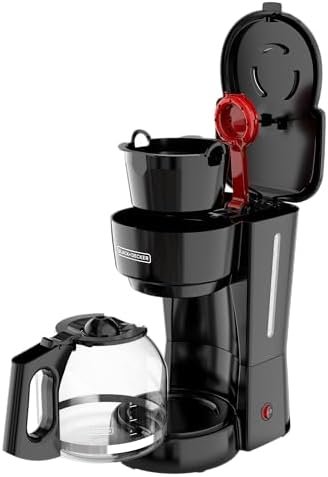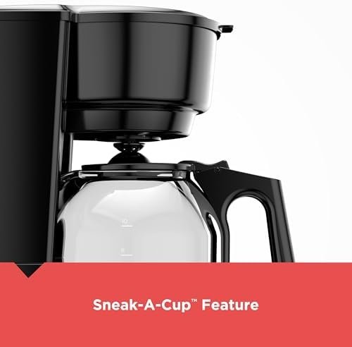 BLACK+DECKER 12-Cup Coffee Maker with Easy On/Off Switch, Easy Pour, Non-Drip Carafe with Removable Filter Basket, Black. This Coffee Maker is your kitchen friendly coffee maker, with just a flip of a switch you get up to 12 cups of hot coffee ready to go. And with the Sneak-A-Cup Feature, you can grab a cup of coffee before brewing ends. Includes a removable filter basket that is dishwasher safe.