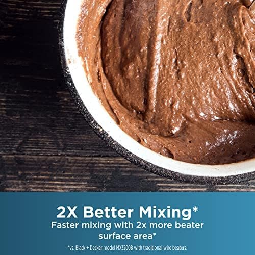 Premium design from BLACK+DECKER. The advanced helix design improves mixing performance* by maximizing beater overlap and mixing ingredients in multiple directions. The BLACK+DECKER Helix Performance Premium Hand Mixer features reinforced nylon beaters with 2x the surface area* and 2x the mixing performance*. With 350 watts of power at peak performance** runs at five speeds, including a reduced* starting speed to help prevent splatters. Plus, a special turbo boost adds a power boost at every mixing speed to combine thick ingredients in no time. This set includes two helix beaters, two dough hooks, and one wire whisk; allowing you to quickly create cake and cookie batters, bread doughs, spreads and dips, homemade whipped cream, or whipped egg whites for a tasty meringue. All accessories are stored conveniently in the smartly designed storage case, which uses the mixer itself as the snap-on cover. Cleanup is a breeze with the auto-eject button that quickly disconnects the dishwasher-safe mixing tools. Plus, you can further prevent messes with the heel and bowl rest, which allows the mixer to sit upright on the edge of the bowl. *compared to BLACK+DECKER model MX3200B with traditional wire beaters **Peak power refers to the maximum power recorded for 100ms during blending.