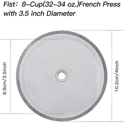 Measurement: the size of the french press replacement screen is approx. 4 inches in diameter, 5/16 inches hole, proper size can fit for most coffee presses, please check carefully before your choosing