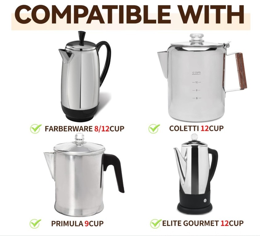 These disposable coffee filters are designed for use with Farberware 8-cup and 12-cup coffee percolators, Coletti Bozeman 12-cup percolator, Primula Today 9-cup percolator, Elite Gourmet EC812 percolator, and Cuisinart PRC-12N classic percolator.