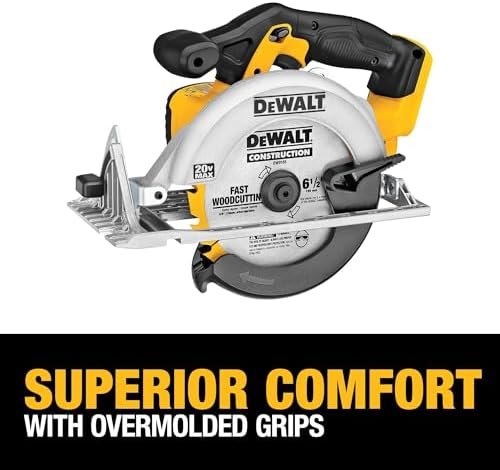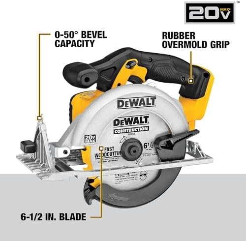 The DCS391B 20V MAX* 6-1/2-inch circular saw with a 6-1/2-inch carbide tipped blade operates on a powerful 5150 rpm motor with a 0 to 50-degree bevel capacity on a lightweight and durable magnesium shoe of the DEWALT 20V cordless circular saw.