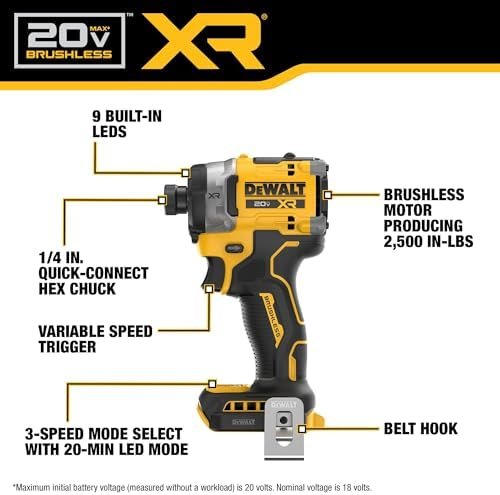 This 20V MAX XR 3-Speed High Torque Impact Driver is engineered for the demands of the pro with a max torque of 2,500 in-lbs., making it our highest torque impact driver†. Maximize productivity with up to 63% faster driving, a no-load speed of 0-3,800 RPM, 9 built-in LEDs, and 3-speed mode select to power through tough jobs. Battery and charger sold separately.