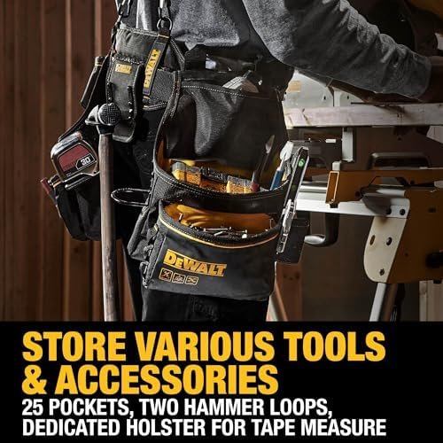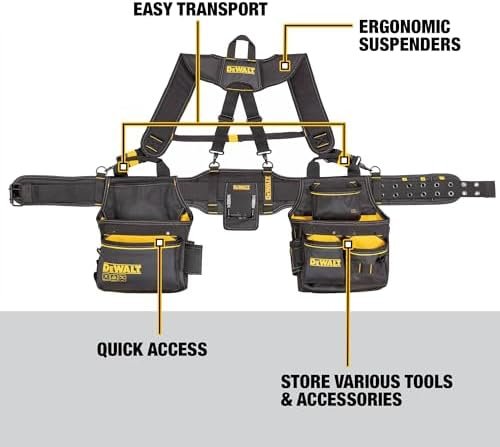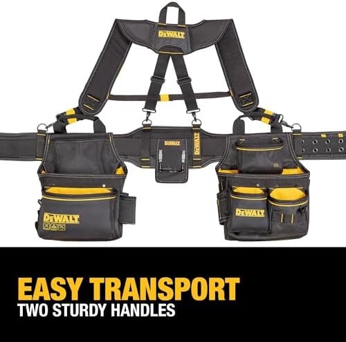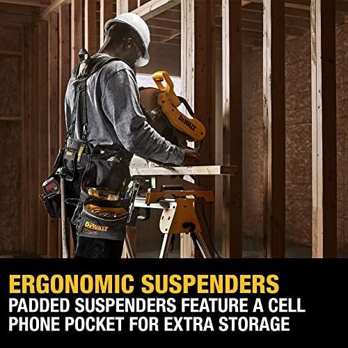 Get quick access to tools, accessories, hardware, and more with the DEWALT Professional Tool Rig with Suspenders. Featuring 25 pockets, a durable construction, and adjustable sizing, this storage solution provides ample room to keep your necessities close at hand.