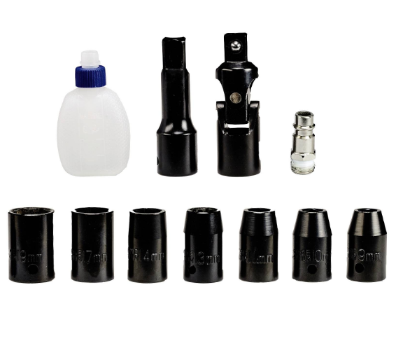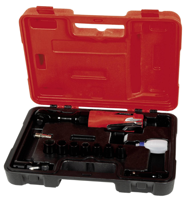 - 1x Ratchet Wrench (Pneumatic) TC-PR 687x socket wrench in sizes 9/10/11/13/14/17/19 millimeters1x extension1x cardan joint1x plug nipple1x Oil Vials (without oil)1x Transport and storage case