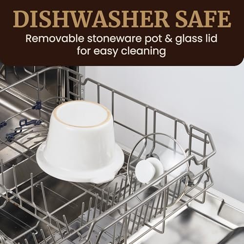 FAST, EASY CLEAN-UP with our dishwasher-safe clear tempered glass lid and removable oval stoneware pot. The exterior heating base can be wiped clean with a damp cloth to maintain its pristine appearance.