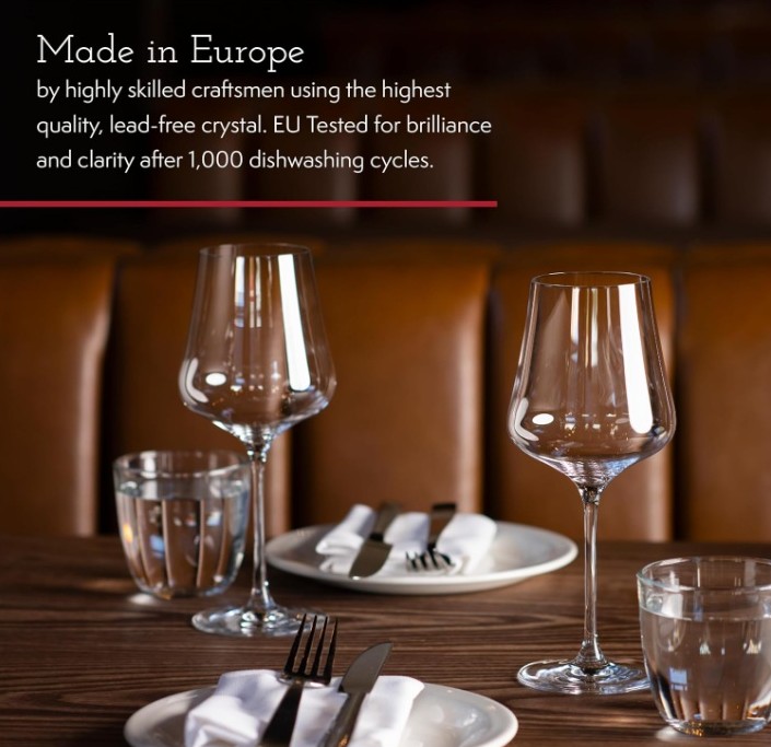 Made from ultra-thin yet durable lead-free crystal, this wine glass set is dishwasher safe and resistant to chipping. Tested to maintain brilliance and clarity after up to 1,000 dishwasher cycles, these glasses are designed for long-term everyday and professional use.