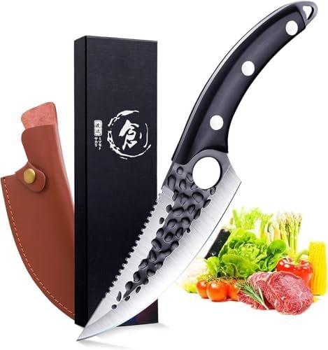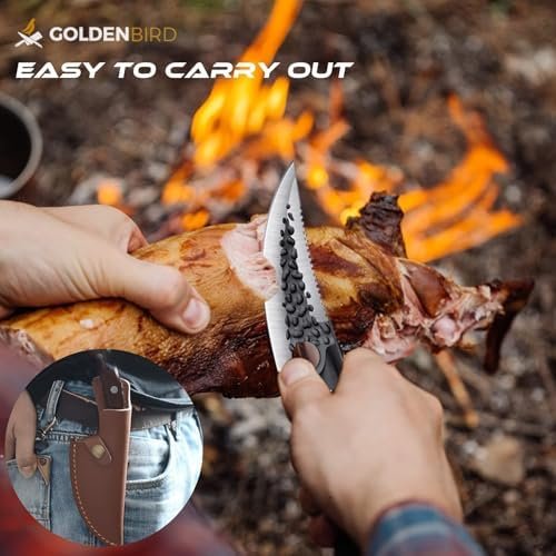 Unique Leather Sheath — The outdoor chef knife is equipped with a practical soft leather sheath to protect the blade. You can put a belt on it for easy carrying when camping outdoor. The portable camping knife is your ideal assistant for Butchering, Fishing, Camping, and Outdoor BBQ activities.