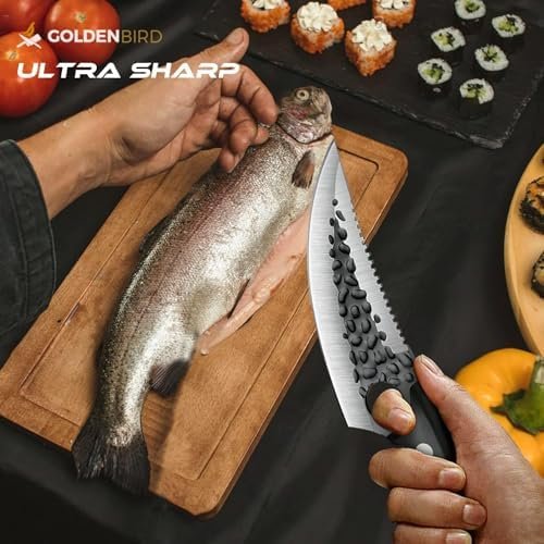 Stylish & Practical – Unique hammered texture on the blade make it beautiful to behold and corrosion resistant while it also helps to prevent foods from sticking. Curved wood handle and large finger hole on the blade provides a secure grip for excellent control while filleting fish, chopping vegetables and deboning meat. The Full Tang design prevent this fillet knife from falling easily.