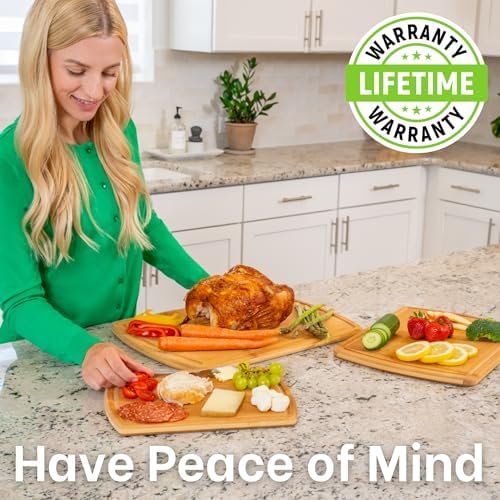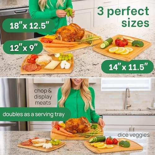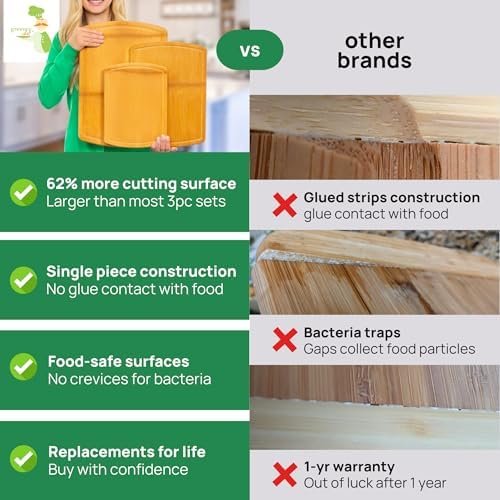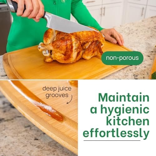 Maintain a hygienic kitchen effortlessly with the natural properties of bamboo. The Greener Chef wooden cutting boards for kitchen feature non-porous, single piece surfaces that resist food particles and liquids from seeping in. This ensures a cleaner, safer environment for preparing your meals, supporting your family’s health and wellbeing with every use.