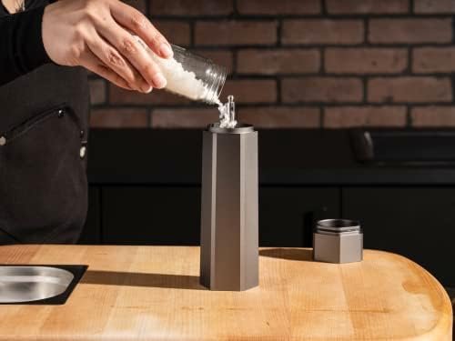 CONVENIENT AND MESS-FREE: Refilling your HexClad Salt Mill Grinder has never been easier thanks to its button-enabled quick-release cap. And with its no-mess bottom cap, your table and countertop will stay free of salt residue.