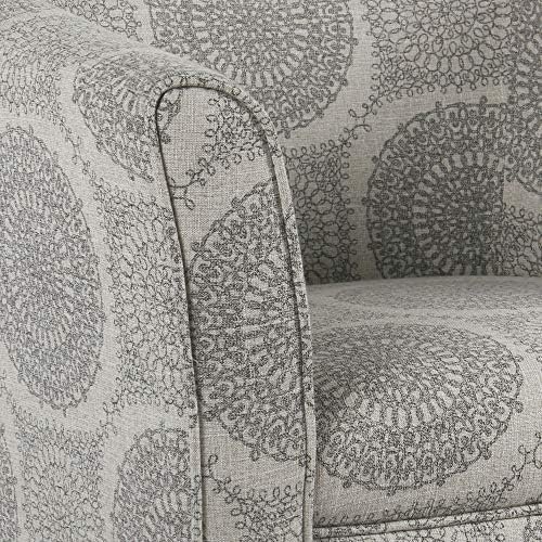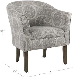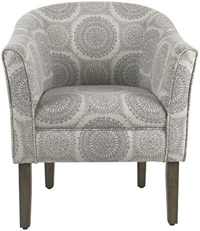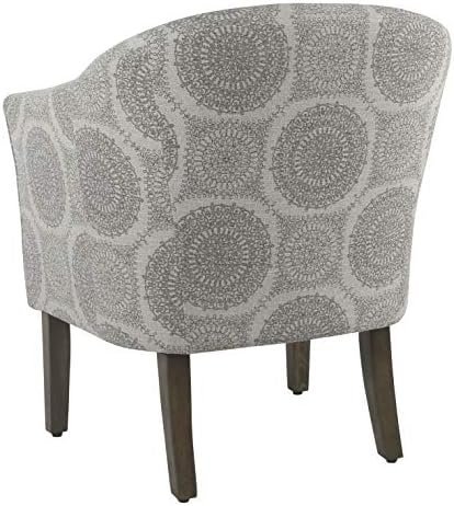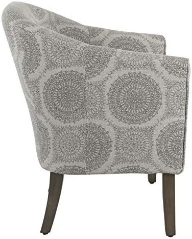 Our modern tub shaped accent chair will add fun and fashion to your living room, bedroom or entryway. With a classic gray medallion pattern on a neutral base with gray washed legs, Our tub chair offers a modern take on a traditional look. This best-selling style is also offered in a range of chunky solid textured fabrics on wood legs. Pair two together for a bold seating solution. Easy to assemble and maintain.