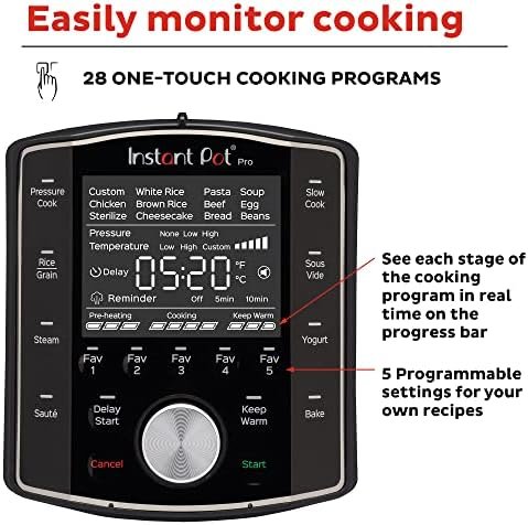 Experience the next generation of convenience with Instant Pot® Pro. It starts with 28 smart cooking programs and adds 5 new Favorite program settings. Spend less time in the kitchen with 20% faster pre-heating and up to 70% faster cooking overall. It replaces 10 kitchen appliances: slow cooker, pressure cooker, sous vide, sauté pan, sterilizer, yogurt maker, food warmer, cake baker and steamer. The upgraded gentle steam release is quieter and less messy with the diffusing cover. And the Pro is filled with thoughtful extras like Easy Grip handles on the inner pot, a large LCD display that’s easy to read, and an auto-sealing lid. The Instant Pot Pro offers the quality, convenience and versatility you’ve come to expect from Instant – discover amazing. Built-in safety features include Overheat Protection, safety lid lock and quick release button for worry-free cooking. And you’ll always know what your Instant Pot is doing, as it features an intuitive cooking progress bar that shows you every step, from preheating, to cooking, to keep warm, so you’re never left guessing. The upgraded inner pot is made from premium quality 304 grade (18/8) stainless-steel and features silicone handles for easy gripping, as well as a flat, tri-ply bottom for the ultimate searing and sautéing. The new gentle steam release diffusing cover reduces noise and prevents countertop splash.