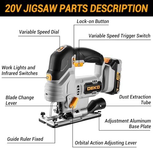 [PACKAGE INCLUDED] The cordless Jig Saw Kit is 1 x 20v jigsaw, 1 x HSS saw blade, 1 x wood cutting blade, 1 x hex key, 1 x parallel guide ruler, 1 x dust-blowing port adapter, 1x 2000mAh battery and 1x charger.
