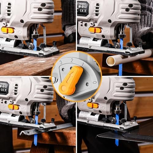 [POWER MOTOR] Max 3000 RPM jig saws for all kinds of wood cutting. Featuring variable speed control that adjusts the cutting speed to suit the blade and application, the jigsaw allows for a precise finish and provides the power you need to make the majority of cuts for your DIY or beginner woodworking projects.
