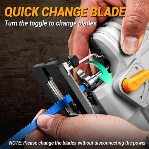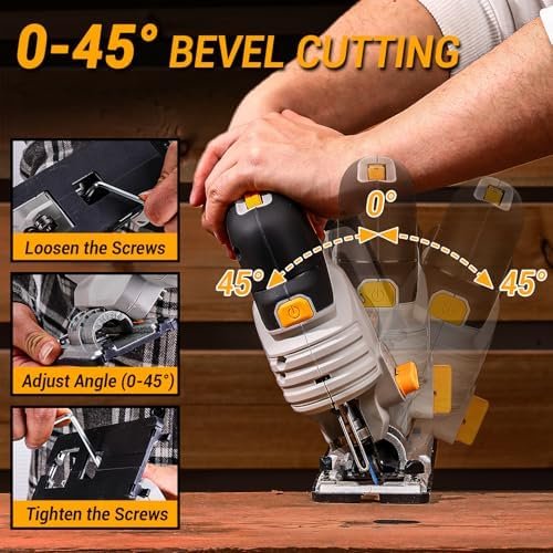 [TOOL-LESS BLADE CLAMP & BEVEL CUTTING] The electric wood cutter with the tool-less saw blade clamp, saw blades can be changed quickly without tools. Sturdy metal base plate adjusts to 0°, 15°, 30° and 45° for different bevel cutting needs.