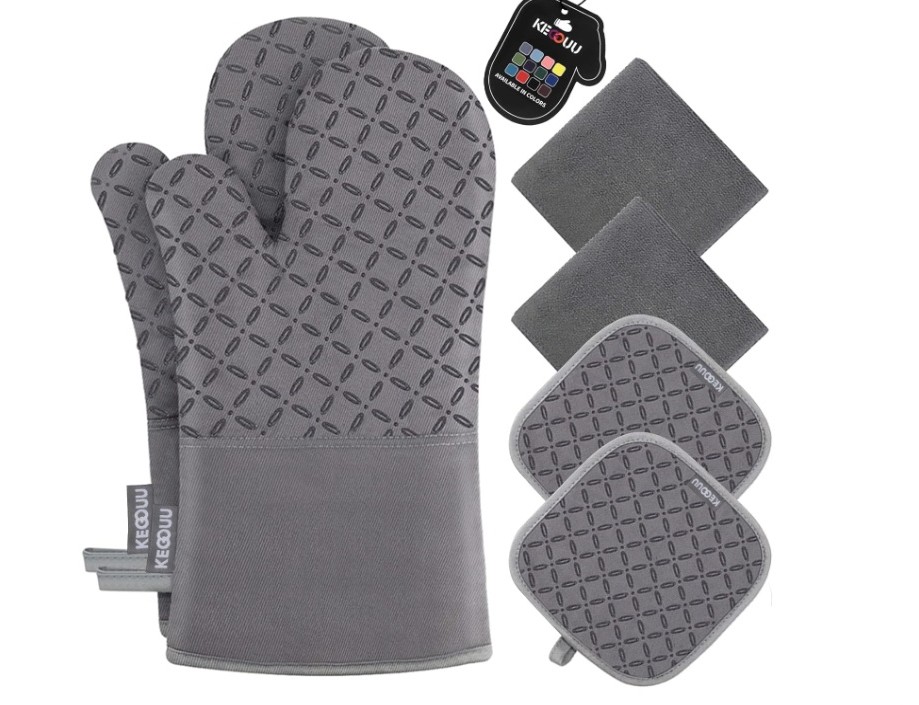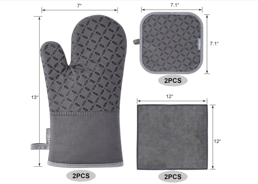 This complete kitchen set includes 2 non-slip silicone oven mitts (7 x 13 inches), 2 pot holders (7 x 7 inches), and 2 kitchen towels (12 x 12 inches). Designed for indoor cooking, baking, BBQ, and outdoor grilling. An ideal kitchen gift for women, men, home cooks, bakers, and grill enthusiasts.