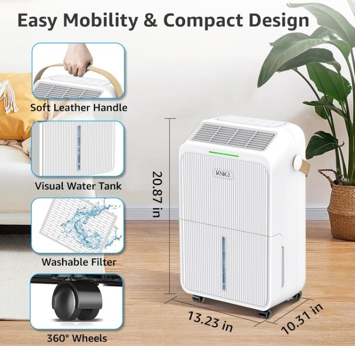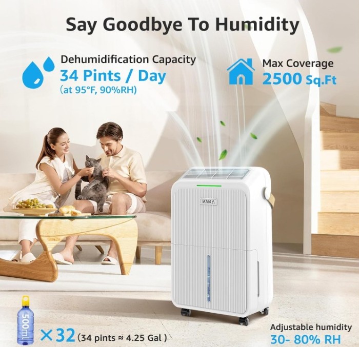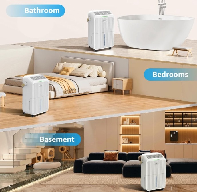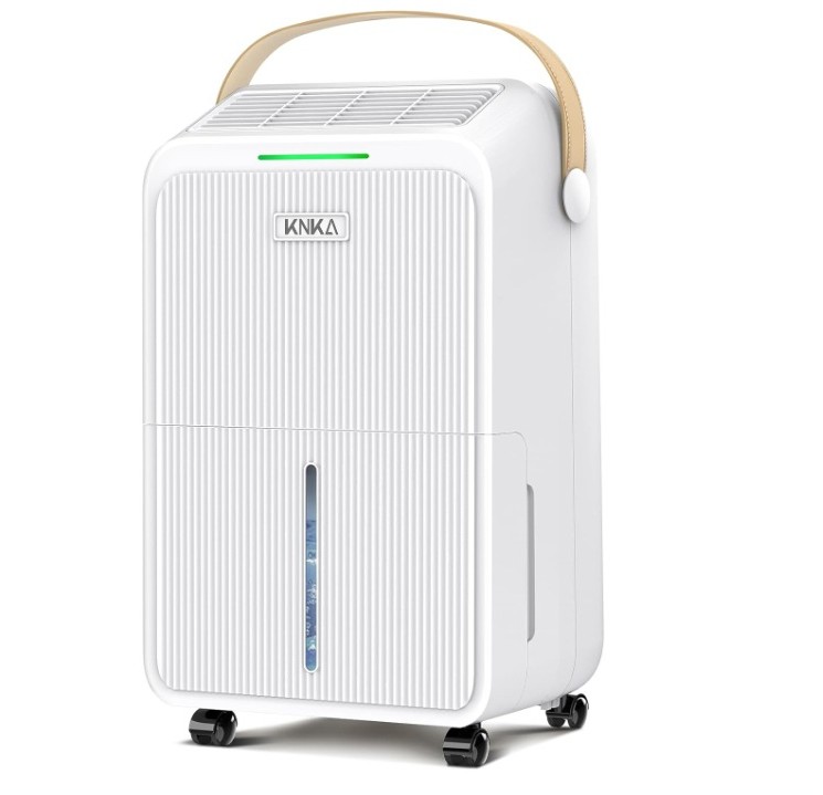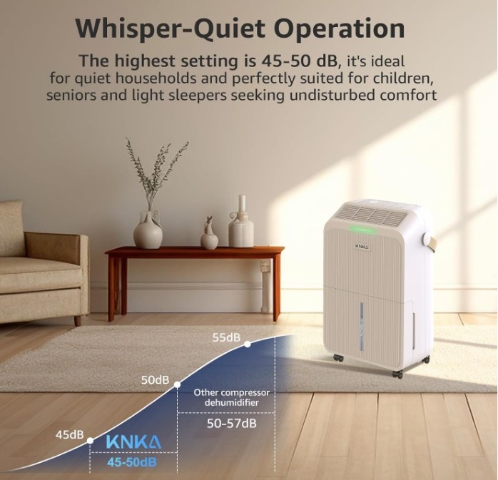 The KNKA dehumidifier is designed for areas up to 2,500 sq. ft. and removes up to 34 pints of moisture per day (at 95°F, 90% RH). Powered by a high-performance yet quiet compressor, it helps maintain a comfortable humidity range of 50%–70%, making it ideal for basements, bedrooms, bathrooms, kitchens, living rooms, laundry rooms, garages, crawlspaces, offices, and RVs.