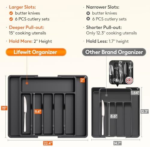 Large Capacity: Organize your kitchen drawer and make more space with this silverware organizer. Comes with two expandable panels on the left and right to store more silverware, cutlery, and kitchen utensils.