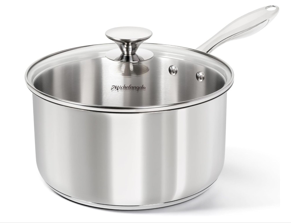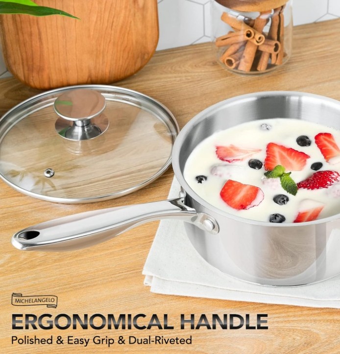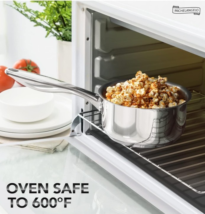 The Michelangelo 4 quart saucepan is crafted from high-quality 304 stainless steel with an aluminum core for fast and efficient heating. The non-reactive stainless steel cooking surface preserves the natural taste of food and ensures consistent, reliable cooking performance.