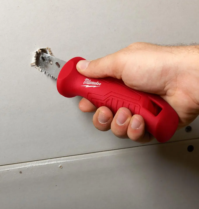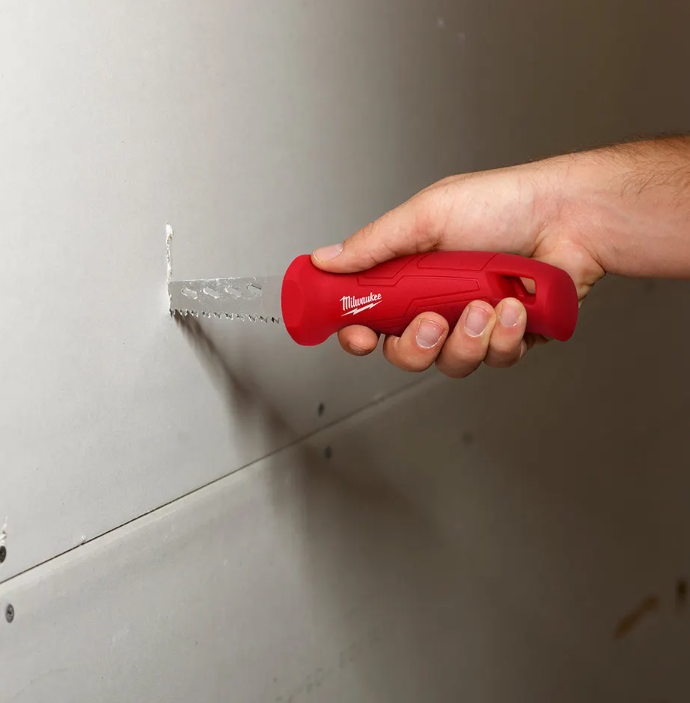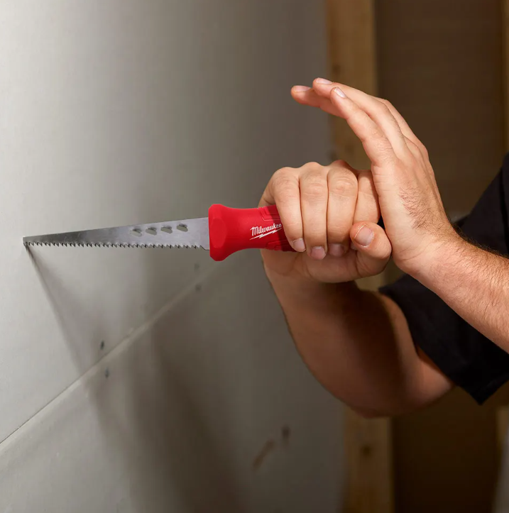 The MILWAUKEE Rasping Jab Saw is the only jab saw on the market to integrate rasping holes along the side of the blade to rapidly expand holes or smooth rough edges of sheetrock after a cut has been made. Complete with rubber over mold to increase comfort and reduce hand slippage, the new saw also features a thick 152mm (6”) plaster/drywall blade for increased durability and life.