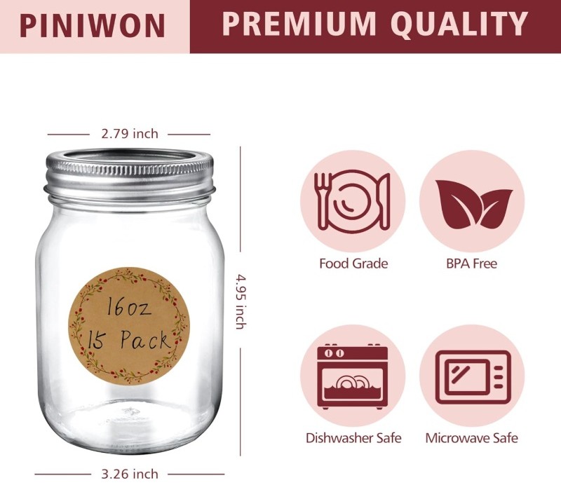 These 16 oz mason jars with lids are made from high-quality, food-grade glass that is BPA-free and lead-free, offering durability and safety for everyday use. The clear glass design allows easy visibility of contents. Dishwasher- and microwave-safe without the lids. For freezing, fill up to 12 oz only.