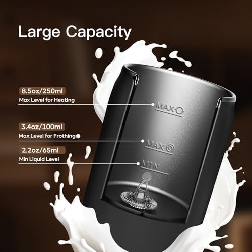 Compact & Powerful: Measuring just 6″ x 3″, it can heat up to 8.5 oz of milk. Our milk frother produces more froth with less milk, to prevent overflow during frothing, please keep the milk content at 2.2 oz to 3.4 oz. Whole milk (fat content > 3%) works even better. After frothing or heating, you need to wait 2 mintunes for the machine to cool down before doing it again