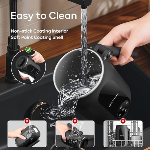 Easy to Clean: This coffee frother has a soft paint shell and a non-stick interior coating, you can easily rinse it with water and then wipe the shell with a damp cloth. Comes with a cleaning brush to help clean stubborn stains. Make sure to cover the charging port with the silicone cap before cleaning
