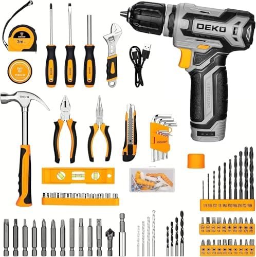【ALL TOOLS IN ONE TOOLBOX】This household tool kit contains the most useful and necessary tools in one box storage as the origanizer of tools sets, no need to buy other tools separately.Including 12V electric power drill cordless, USB, bit set, drill sets, screwdriver set,hex key, magnetic bits holder, sockets, bit holder, tape measure, insulating tape, fasteners, claw hammer, hammer cap,adjustable wrench, level, utility cutter, pliers set, plastic toolkit case.