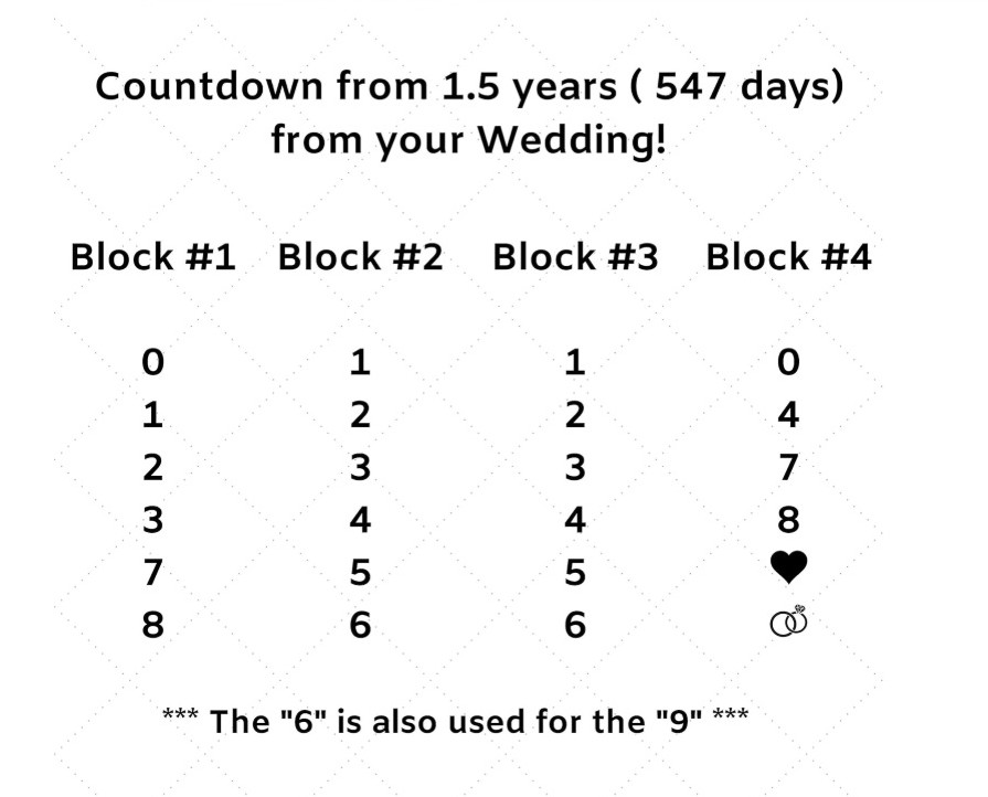Designed to count down from up to 547 days (1.5 years) before the wedding, making it perfect for long-term planning and engagement periods.