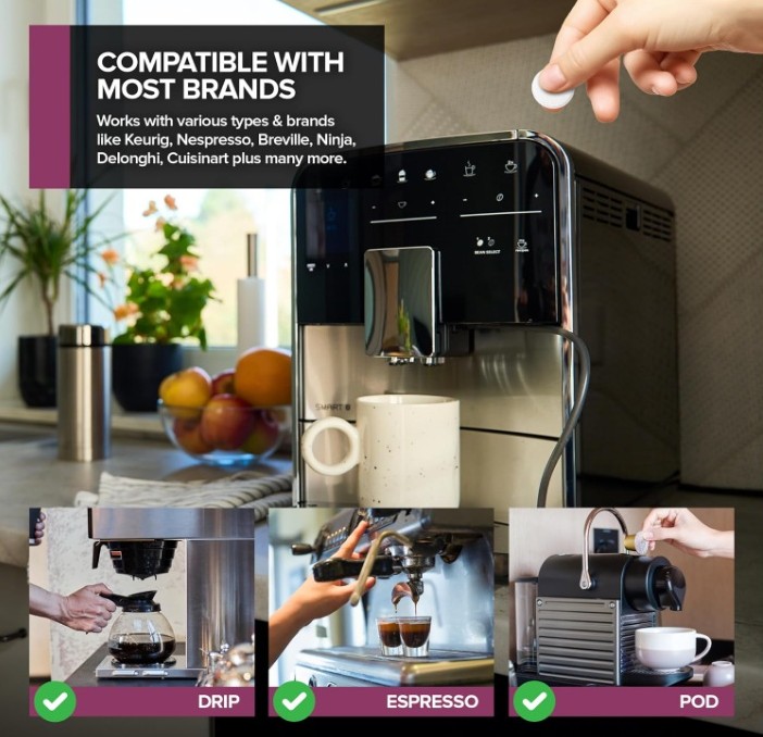 Designed to work with most coffee machines, including pod systems, single-serve brewers, espresso machines, and drip coffee makers, providing a versatile cleaning solution for home and office use.
