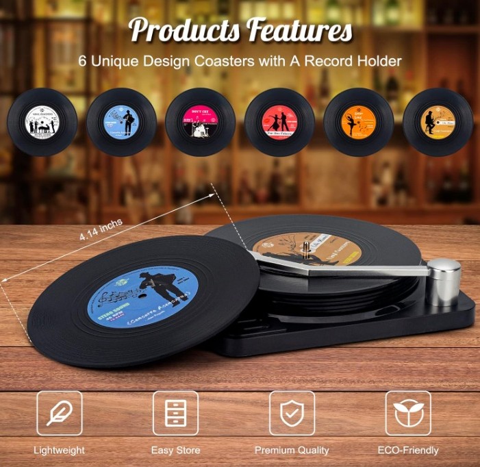 Rediscover the timeless charm of classic vinyl records with this vintage-inspired coaster set. Designed to resemble authentic vinyl records, the set includes six record-style coasters and a holder inspired by a retro record player, creating a striking throwback atmosphere for your home, office, or entertainment space.