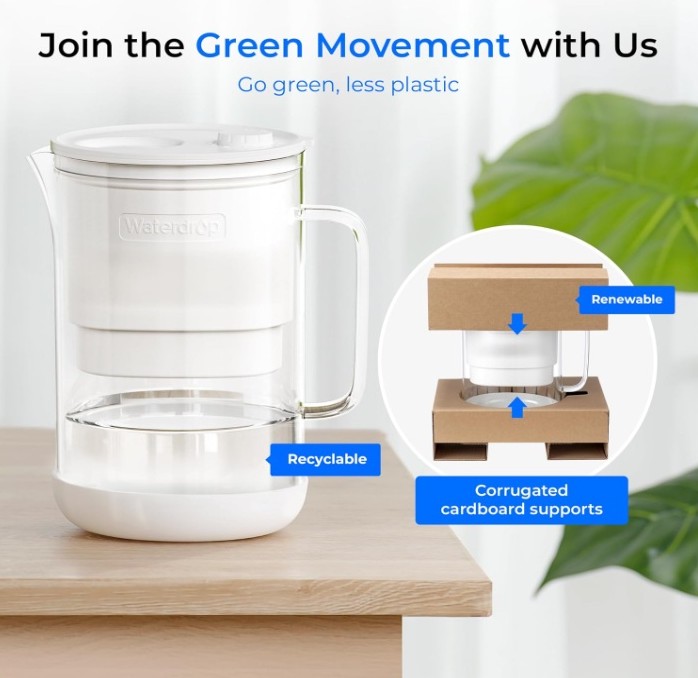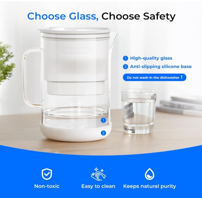 Crafted from high-quality, non-toxic glass, this glass water filter pitcher offers a sustainable and environmentally conscious alternative to plastic. Glass does not release harmful substances into water, helping preserve purity and taste while supporting eco-friendly living. Designed for easy cleaning; hand wash only. For enhanced durability, the pitcher features a sturdy plastic inner liner.