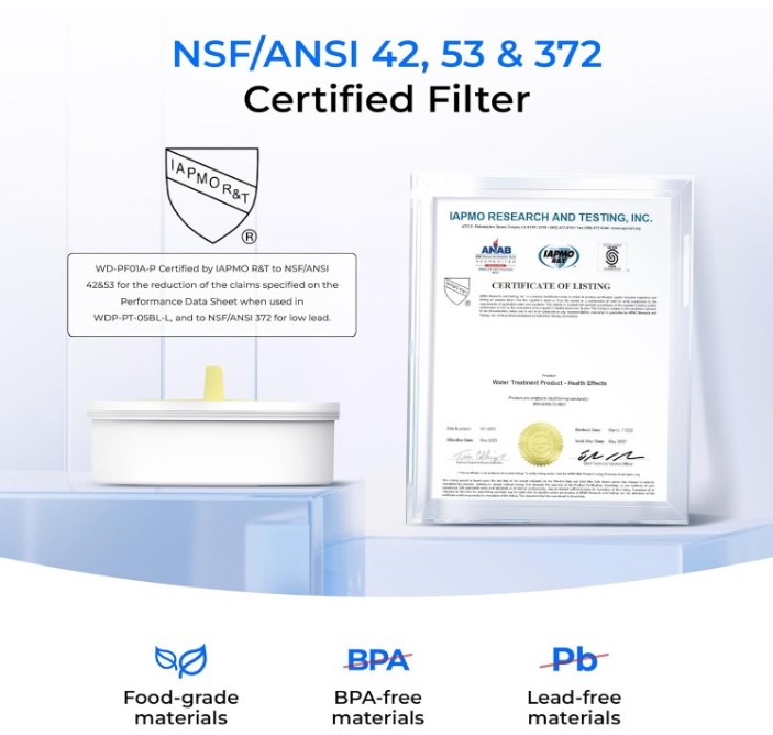 The filter is NSF/ANSI 42 certified for chlorine, taste, and odor reduction; NSF/ANSI 53 certified for mercury reduction; and NSF/ANSI 372 certified for lead-free materials (≤0.25% lead), ensuring trusted filtration quality and safety.