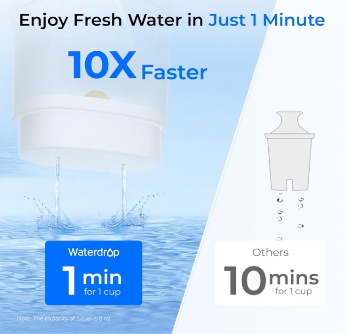 Designed for convenience, this 10-cup glass water filter pitcher delivers a high flow rate of up to 8.5 oz per minute, filling an 8 oz glass in under one minute. Enjoy quick access to fresh, filtered water without long waiting times.