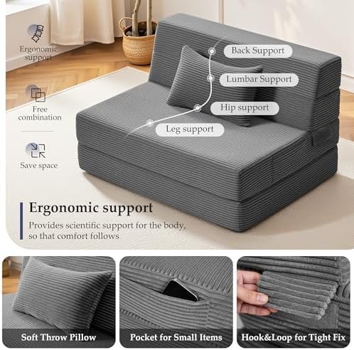 【4-in-1 Versatile Design】Easily converts into a sofa chair, floor lounger, ottoman, or folding mattress, making it perfect for relaxing, reading, gaming, watching movies, or providing an extra sleeping solution for overnight guests.